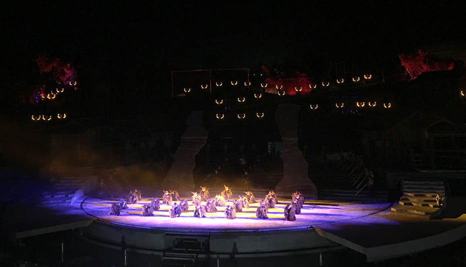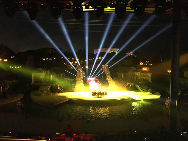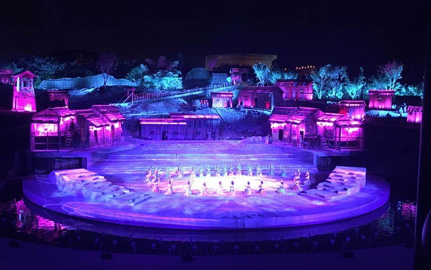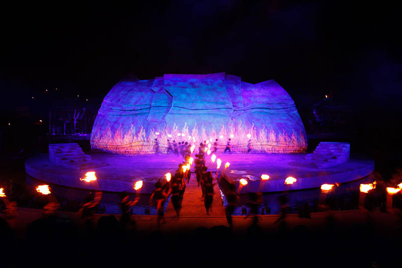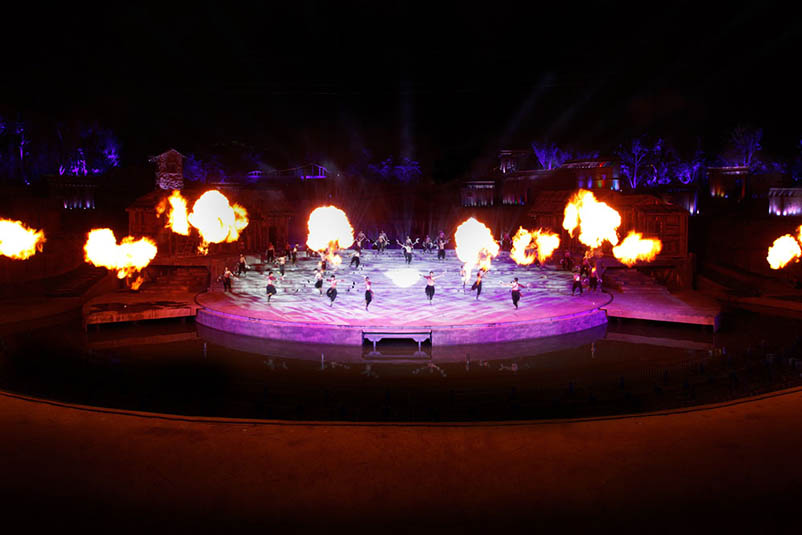 《阿惹妞》作為一部風(fēng)情實(shí)景劇,演出舞臺(tái)全部為戶外實(shí)景,既有遠(yuǎn)山又有流水,場景宏大,因此對(duì)舞臺(tái)景物布光要求很高,不僅要使景物光線分布均勻且達(dá)到足夠的亮度,對(duì)燈光的層次性要求也非常高,既要保證遠(yuǎn)方山峰的輪廓清晰可見,又要讓觀眾看得清舞臺(tái)中區(qū)演員的表演。G12 HYBRID 能夠做到大范圍均勻鋪光,且具有超高光通量,發(fā)光效率高的同時(shí)具備遠(yuǎn)距離照射的能力,在保證遠(yuǎn)景和中景清晰的前提下,運(yùn)用G12 HYBRID亮度變化,配合現(xiàn)場光焰等特效,能夠制造出極具擴(kuò)張感的震撼視覺效果。
