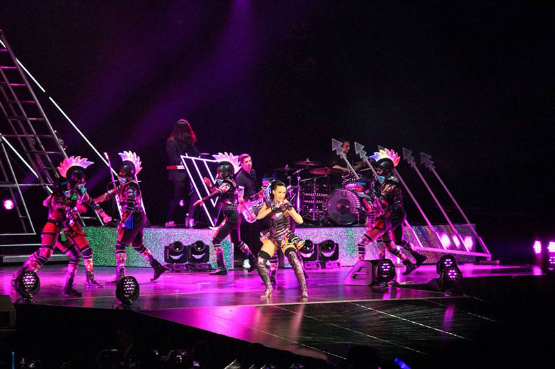 Katy Perry以開場曲《Roar》拉開序幕,之后《E.T》、《California Gurls》(加州女孩)、《TeenageDream》(花漾年華)、《Wide Awake》(如夢初醒)等金曲一首不落,引發(fā)粉絲的尖叫聲和喝彩此起彼伏。配合演唱會(huì)主題,水果姐造型百變服飾斑斕,她時(shí)而變身俏麗貓女在《Hot N Cold》(忽冷忽熱)的音樂中與舞伴嬉戲,時(shí)而以埃及艷后的高貴之姿騎優(yōu)雅坐上《DarkHourse》(黑馬),一轉(zhuǎn)眼又身穿向日葵長裙化身女神抱著吉他動(dòng)情演繹《The One That Got Away》(離開的人是你),讓人看得眼花繚亂。
