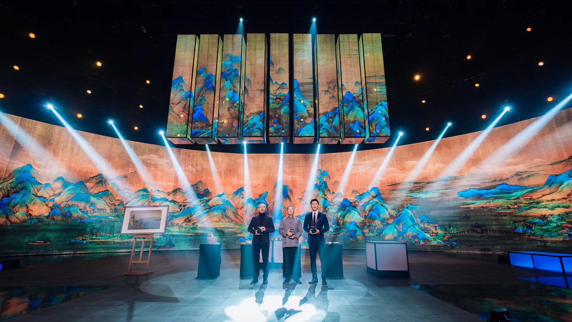在舞美方面,《國(guó)家寶藏》節(jié)目組特別將所有舞臺(tái)主視覺(jué)都設(shè)置在一塊長(zhǎng)43米、高7米的巨型LED環(huán)幕上,讓觀眾在見(jiàn)不到國(guó)寶實(shí)物的情況下也能以直觀的感受體驗(yàn)到國(guó)寶的震撼美。在整個(gè)舞臺(tái)的設(shè)計(jì)上,節(jié)目組將中國(guó)古典韻味和現(xiàn)代舞臺(tái)科技相結(jié)合,融合紗盒投影視覺(jué)呈現(xiàn)、透視冰屏柱視覺(jué)呈現(xiàn)、透視冰屏柱臺(tái)型變幻、巨型環(huán)幕視覺(jué)呈現(xiàn)四大特點(diǎn)于一體。在場(chǎng)景環(huán)境的構(gòu)建與更替上都呈現(xiàn)出精致逼真的舞臺(tái)效果,這種舞臺(tái)視覺(jué)上的極致沖擊力也成為節(jié)目吸引眼球的一大亮點(diǎn)。
