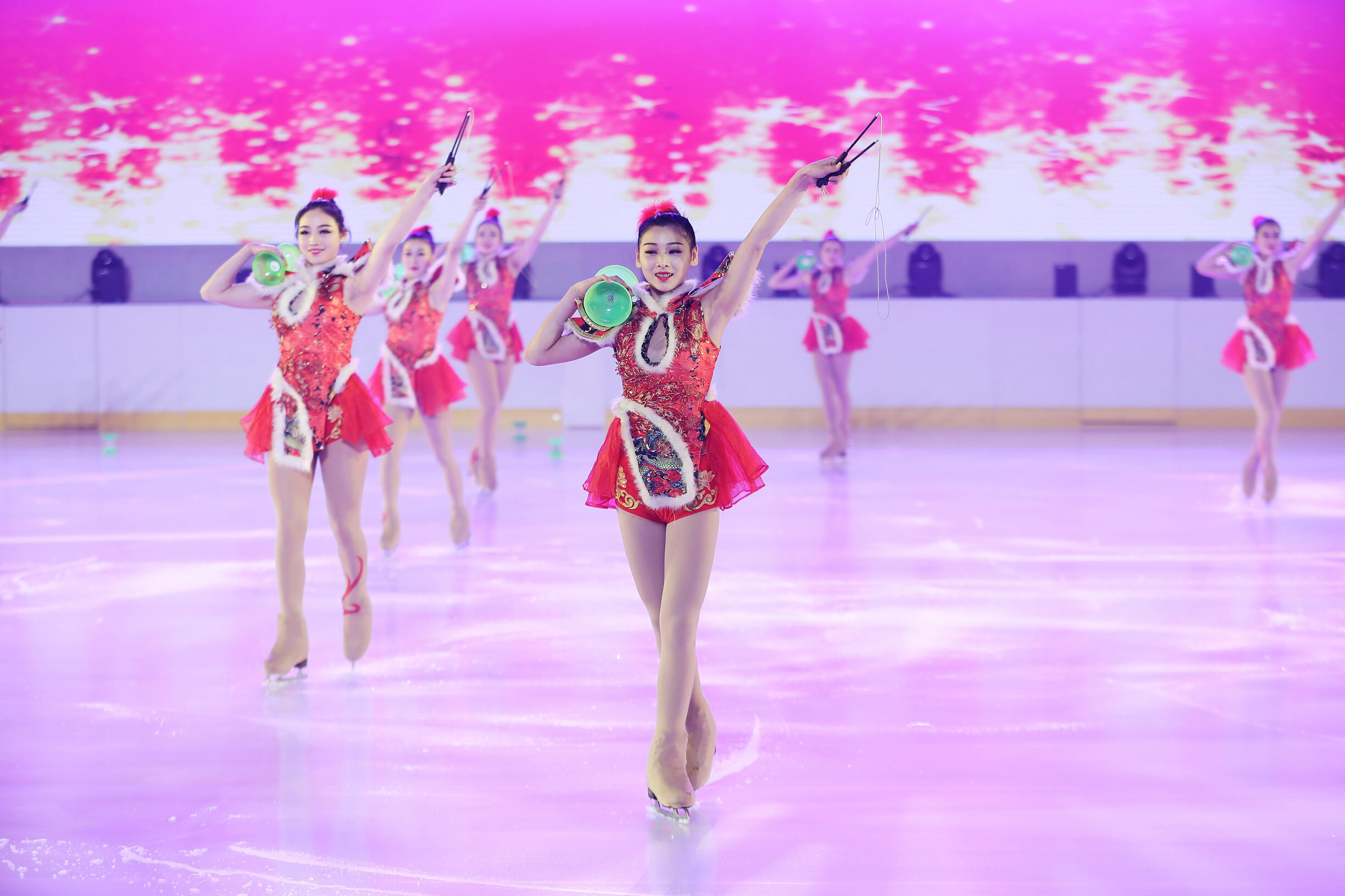 令人驚艷的冰上雜技表演;冰雪仙子、卡通雪娃娃、老年人、青年人跟隨冬奧冠軍在冰上翩翩起舞;專業(yè)花樣滑冰組合表演高難度花滑互動等冰雪演出贏得觀眾陣陣掌聲。
