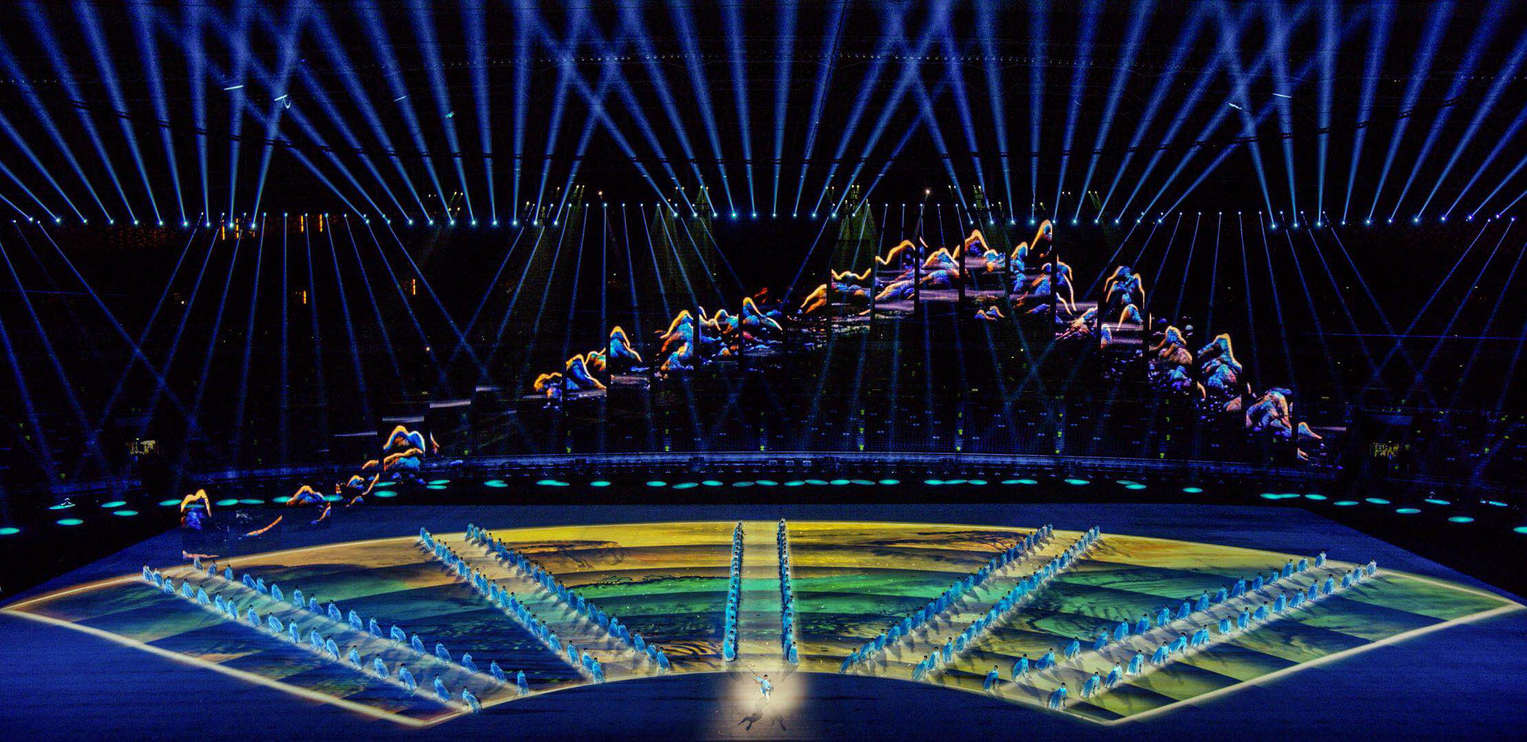 運(yùn)動(dòng)會(huì)開幕式的舞美設(shè)計(jì)以呈現(xiàn)山西特色為重點(diǎn),以寫意的方式展現(xiàn)山西人文魅力和精神風(fēng)貌。借助威亞系統(tǒng),25塊彩幕隨著演出內(nèi)容在空中變換造型,與地面全景投影相得益彰,打造一場(chǎng)歷史積淀與科技創(chuàng)新交織融合,人文魅力與時(shí)代精神交相輝映的開幕式表演。