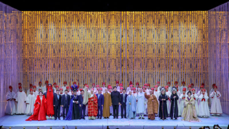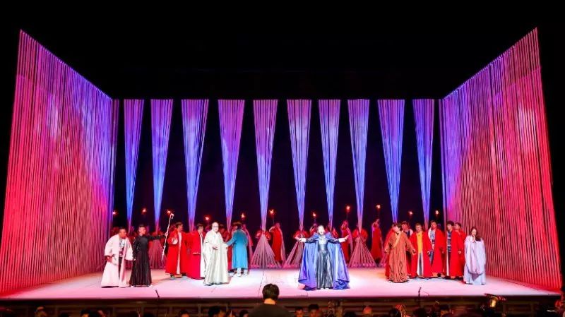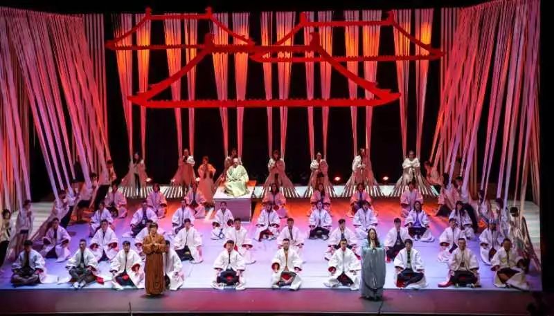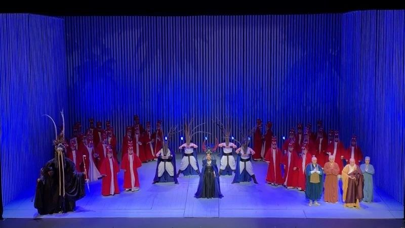 《鑒真東渡》運用歌劇這一國際通識的藝術(shù)表達話語,配合有感染力的表演,富有創(chuàng)意的舞美燈光設(shè)計,生動、立體的人物架構(gòu),在遵循歌劇藝術(shù)規(guī)律的基礎(chǔ)上,創(chuàng)造性地將江蘇民歌元素和佛教音樂的旋律融入其中,讓歌劇更富有地域特色,呈現(xiàn)出不同于純粹西方歌劇的風格,展現(xiàn)出東方所特有的歷史厚重感與人文風貌。