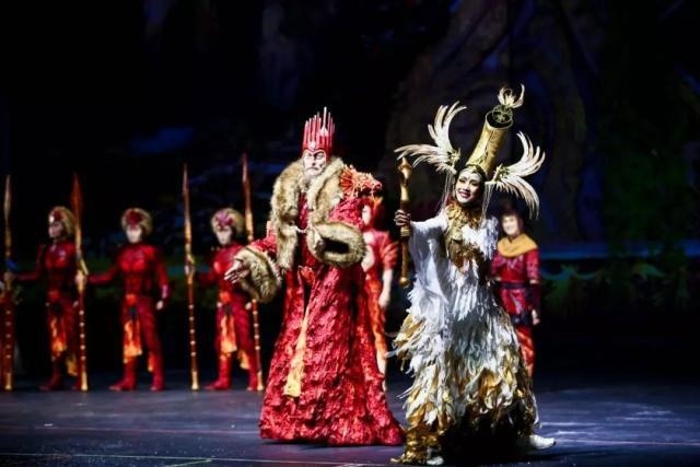 演出中的很多形象都有著東西方文化的雙重印記。主人公的形象既能讓觀眾聯(lián)想到孫悟空也帶著西方傳統(tǒng)神話的人物印記。劇中有東西方兩個(gè)王國,西方的是以龍和紅色元素來代表,而東方的則以鳳凰和金色元素來代表。