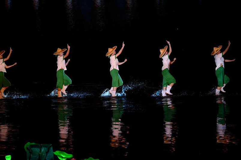 由于實(shí)景演出的舞美要求不能破壞大自然的原始形態(tài),因此現(xiàn)場(chǎng)對(duì)視覺效果的塑造都押在了燈光創(chuàng)作上,由于現(xiàn)場(chǎng)表演規(guī)模宏大,尤其是在水面上染色,要做到色彩單純,光線分布均勻且具備足夠的亮度,同時(shí)保證遠(yuǎn)景、近景的清晰可見,給觀眾帶去強(qiáng)烈的視覺感受。