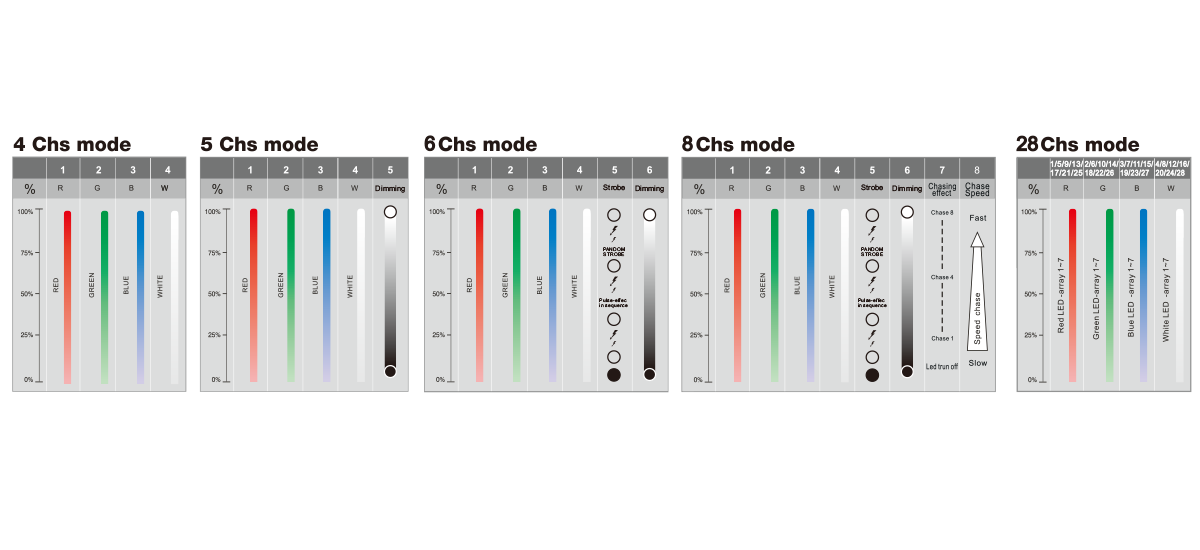 5個(gè)通道模式:4/5/6/8/28個(gè)國(guó)際標(biāo)準(zhǔn)DMX512 通道