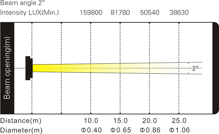 光斑角度:2°,獨特的光路結(jié)構(gòu)使光束效果更強更亮